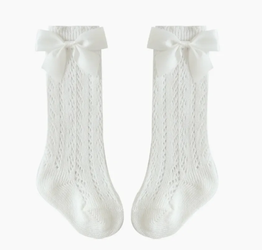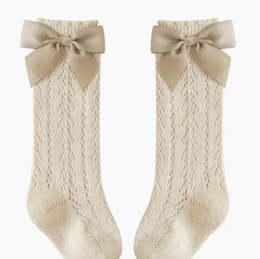 he Snug Baby Company’s Crochet High Socks with Grosgrain Bow are the perfect combination of style and comfort for your little one. These neutral-toned socks feature a delicate openwork pattern and large matching bows,